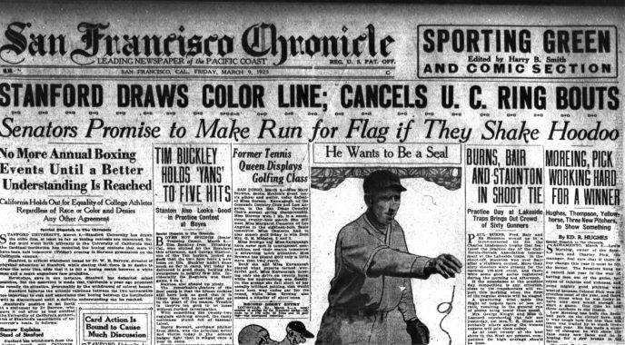The controversy immediately exploded in newspapers around the Bay. The San Francisco Chronicle‘s sports section featured the banner headline: “STANFORD DRAWS COLOR LINE; CANCELS U.C. RING BOUTS.” In a commentary headlined, “Card Action Is Bound to Cause Much Discussion,” the Chronicle pointed out that Stanford had never questioned the presence of Black California star Walter Gordon on the football team and that many eastern schools, including Harvard, included Black students on their sports teams without undue difficulty. The Oakland Tribune‘s head line was almost identical to the Chronicle‘s: “Stanford Draws Color Line; Refuses to Meet U.C. Boxers.” The Oakland paper noted that Stanford had previously been willing to compete against Black baseball players from California.