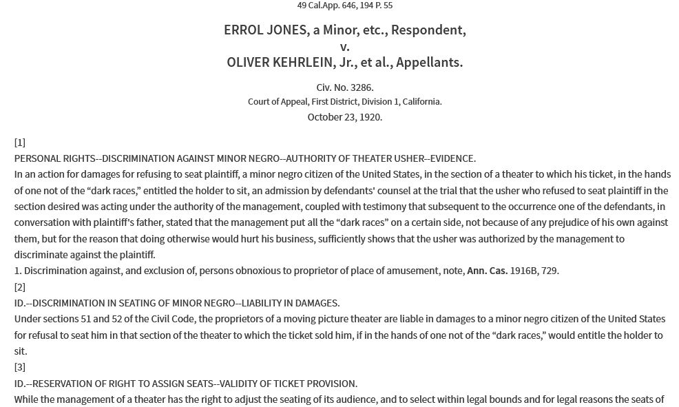 in 1923, the competition was scheduled for Palo Alto once again. And once again, there was an African-American on the California team. 23-year-old Errol Jones of Fresno had a history of standing up for principle. In 1918, Jones and his younger sister, Hazel, had been refused seats in a section of a Fresno movie theater reserved for white patrons. The Jones family sued for violation of a California statute, Civil Code section 51, that barred discrimination in public accommodations based on race. Errol Jones won at trial and was awarded $100 (about $1,700 in 2022 dollars). The theater owner appealed, arguing that a “separate but equal” policy was allowed by the then-existing U.S. Supreme Court precedent of Plessy v. Ferguson. Jones’ attorney argued that Plessy did not apply because California had passed a statute to the contrary. The Court of Appeal agreed, upholding the verdict in favor of Errol Jones and setting an important precedent in California. In fact, the 1920 decision of the Court of Appeal in the case of Jones v. Kehrlein has been cited as precedent in the California appellate courts as recently as 2020.