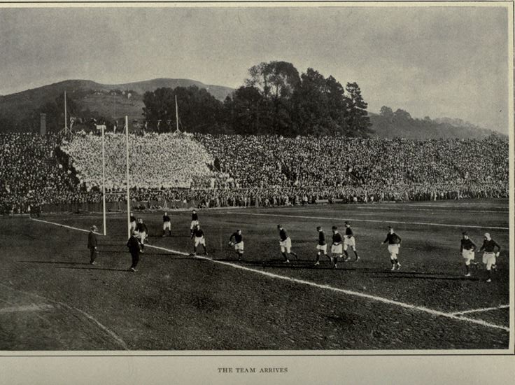 A crowd in excess of 73,000 showed up for that first game at Memorial Stadium (hundreds more than the stadium’s official capacity of 72,609). Another 7,000 fans perched on Big C Hill, which began to earn its new name of “Tightwad Hill” that day. This crowd of more than 80,000 was the largest ever to see a sporting event in the western United States. The undefeated Bears were the favorite. But the game was expected to be close, since most of Cal’s Wonder Team players had graduated, and because Stanford also had an excellent team that year. The only blemish on Stanford’s 7-1-0 record was a 14-7 loss to U.S.C.
