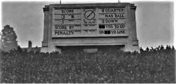 The scoreboard at Memorial Stadium showing the final score of the 1923 Big Game. It is hard to read in this photo, but the upper left shows “C” with 9, and “S” with a blank.