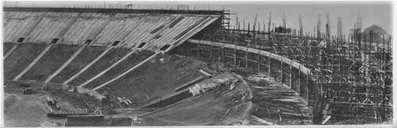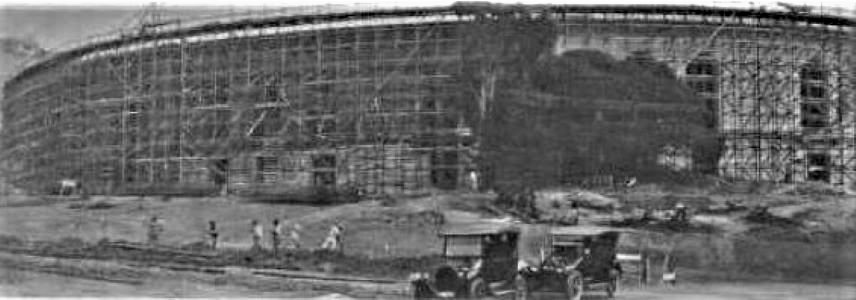 Horse-drawn wagons bringing construction materials to the stadium site.
