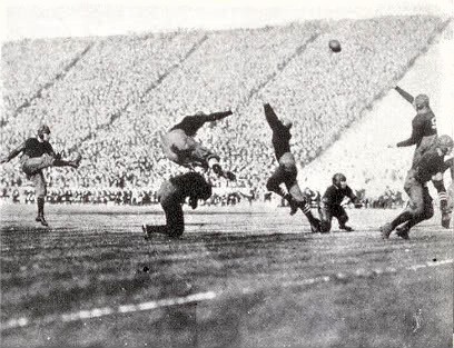 One of the many punts during the first game played at Memorial Stadium on November 24, 1923.