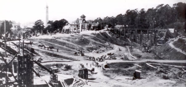 Sections of Big C Hill (“Tightwad Hill”) and Charter Hill were cut away for the east side of the stadium (note the houses on Charter Hill at right – these neighbors opposed the construction of the stadium from fears of traffic congestion and the ruining of their views of the Bay).