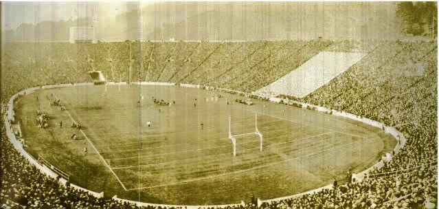And Palo Alto did not have the only grand new stadium in California. In 1922, the Bears were invited to play the University of Southern California in a regular season game to inaugurate the brand-new Rose Bowl (resulting in a 12-0 Cal win). And the following year, Cal played U.S.C. again, this time at the brand-new Los Angeles Coliseum (a 13-7 Cal win). The Bears wanted a stadium to match those in Palo Alto, Pasadena, and Los Angeles. While Stanford and U.S.C. were having trouble selling out their enormous stadiums, the Bears were drawing sell-out, standing-room crowds of 25,000-plus to their games at California Field, and having to turn thousands of fans away.