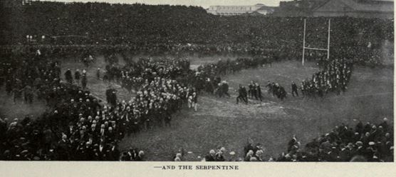 To generate publicity and support for seating subscriptions, the starting eleven of the Wonder Team pull a replica of the proposed stadium in front on Wheeler Hall, toward Sather Gate.