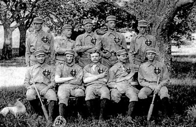 The 1895 Cal Track and Field Team. Standing in back: Theodore Barnes, Louis T. Merwin, Arthur North (manager). Seated: Philip Bradley, Chester Woolsey, William C. Patterson, Fred W. Koch, Robert Edgren, Ernest Dyer, James Scoggins. In front: Harry Beal Torrey, Melville Dozier.The Golden Bear banners they carried east with them are in the back.