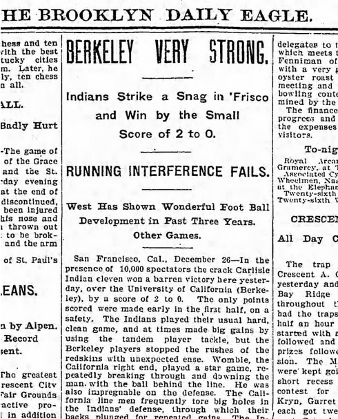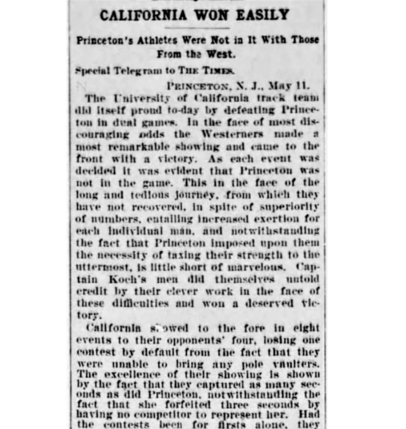 “The University of California track team did itself proud today by defeating Princeton in dual games. In the face of the most discouraging odds, the Westerners made a most remarkable showing and came to the front with a victory.”