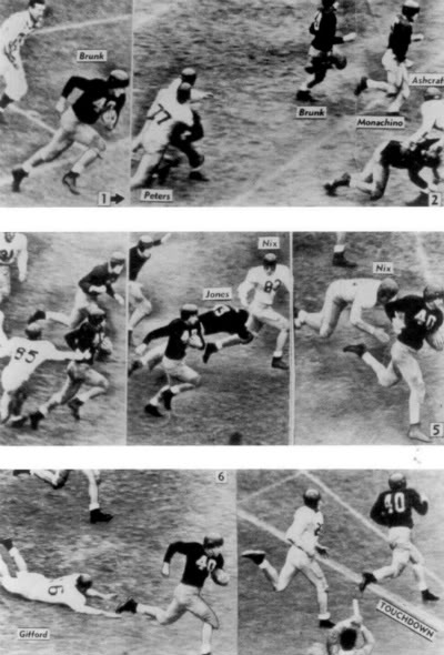The Rose Bowl loss was all the more discouraging to Cal fans, because the Bears were losing many of their best players. Most notably, Jackie Jensen, with Pappy Waldorf’s encouragement, decided to leave school a year early to accept an offer to play professional baseball. (He would become the first person ever to play in the Rose Bowl, the World Series and the All-Star game). Nevertheless, Waldorf’s 1949 Golden Bears remained strong. They were 4-0 heading into another big showdown with USC, in what would be the Bears’ first televised game. USC took a 10-7 lead in the fourth quarter on a Frank Gifford field goal. But on the ensuing kick-off, Cal’s Frank Brunk fielded the ball in the end zone and, with extraordinary blocking from his teammates, ran it back for a 102-yard touchdown. The last USC player with a shot at him was Frank Gifford, who is seen in the photographs face down on the turf, having missed the tackle. Because the game was televised, Brunk’s run became legendary. California ended up with a 16-10 victory.