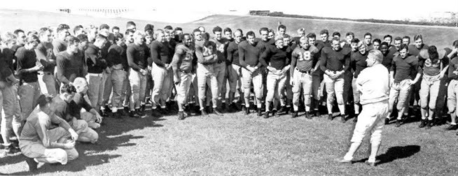 Pappy Waldorf meets with the 1947 Golden Bears at their first practice.