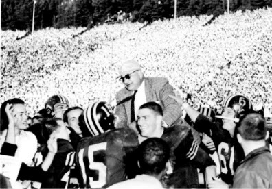 Pappy Waldorf is carried off the field by his players after the 1956 Big Game