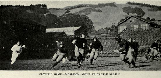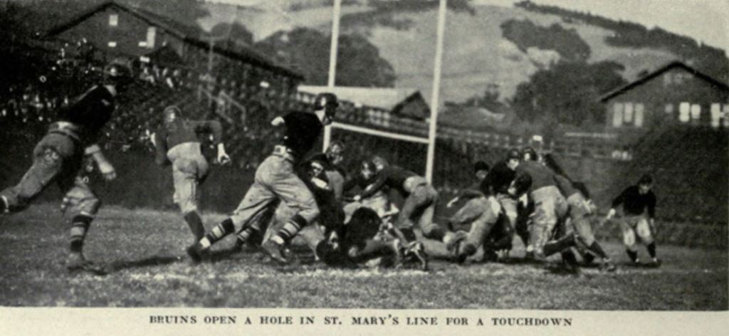 As might have been expected of players who had only begun practicing as a team a few days earlier, the Bears got off to a slow start. The game was mostly a defensive battle. According to Doug Montell of the Oakland Tribune, “practically the entire game was marked by a punting battle between Morrison of the Bruins [i.e., the Bears] and Dobson of the Olympic Club, in which the Blue and Gold kicker finally came out on top.” The Chronicle‘s van Horn described the first half as “a poor spectacle. It was kick, kick, kick – first California and then the Olympics.” He did commend the strong defense of Cal’s Brick Muller describing the first half as essentially, “Brick Muller versus the Olympic Club, for Brick stopped practically every play during this time.”