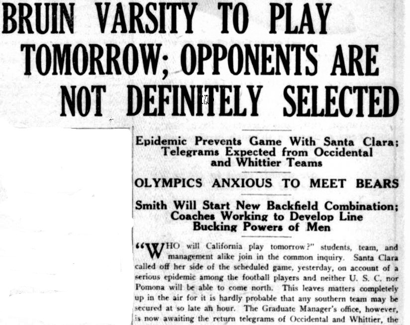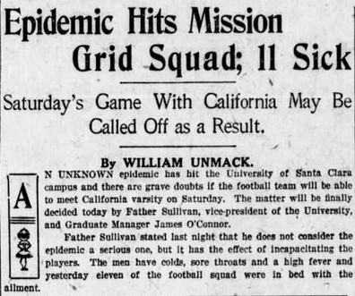 The Santa Clara game was set for Saturday, October 2, 1920 at California Field on the Berkeley campus. Santa Clara looked to be a good team. They had a 9-0 win over the Olympic Club under their belt and would be coming off a bye. But on Wednesday, September 29, the news broke: an epidemic was running rampant through the Santa Clara team. The San Francisco Examiner‘s William Unmack reported that players were suffering from sore throats and high fevers, and all eleven starters “were in bed with the ailment.” Santa Clara’s vice president, Father Sullivan, said he did not consider the epidemic to be serious, but it did incapacitate the players.