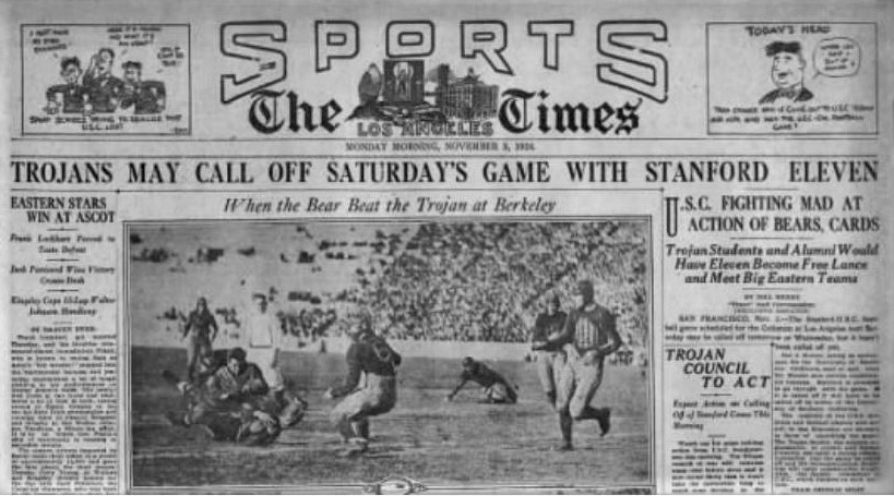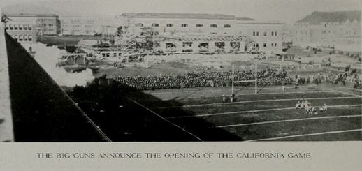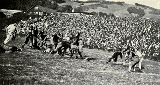 Then Stanford’s team, seeking to make a dramatic entrance, ran onto the field with only a minute to spare before kickoff. Everything was in place. The fans, the teams, the officials. The game that would decide the Pacific Coast Conference championship was ready for kickoff.