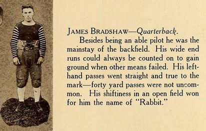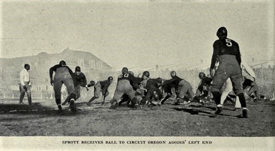 During the week preceding the game, Coach Smith had pared back his team by several dozen players, bringing it down to the manageable number of 30 from the more than 300 students who had shown up for try outs two weeks earlier and the 100 who had been on the roster during the Olympic Club game. As expected, Smith announced that Pesky Sprott would start at halfback in place of Andrew “Shad” Rowe. Otherwise, the lineup was largely the same as the previous week.