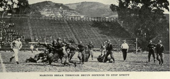 The game began in a fairly ordinary fashion. The Marines received the opening kickoff and according to the Daily Californian, for the “initial three minutes of play looked as though they were likely to prove dangerous.” But then they fumbled and, “the slaughter started.” The Bears marched down the field and “Sprott tore through outside tackle for the first touchdown.” After the teams traded a couple of few punts, Archie Nisbet rushed for a second touchdown. At the end of the first quarter, the score was a still-reasonable 14-0, with the Bears out-gaining the Marines 49-30. But then came the second quarter.