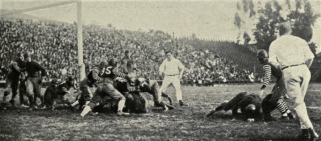 It’s easy to see why the Bears were heavy favorites. They were near the end of what still remains one the greatest seasons in college football history with wins over the semi-pro Olympic Club and over the Mare Island Marines, a 127-0 destruction of St. Mary’s, and lop-sided victories over Nevada, Utah and a highly regarded Washington State team. Only a 17-7 win at Corvallis over the Oregon Agricultural College (now Oregon State) had been remotely close. And this perfect 7-0 record was just the beginning. The Bears had outscored their opponents by a total of 444-14 and out-gained them by similar margins. The two touchdowns given up by the Bears had been the the result of a California fumble on a punt return against Nevada and a trick play by the Oregon Agricultural College involving a fake player substitution. Otherwise, the Golden Bear defense had been unmovable.