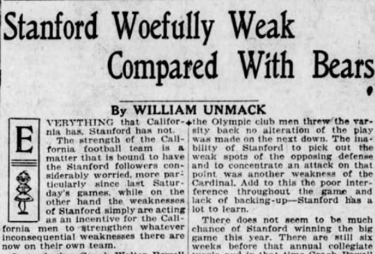 In Berkeley, by contrast, the expectations for a truly memorable season were growing. The papers continued to predict a Pacific Coast Conference championship for the Bears and perhaps more importantly, a big win in the Big Game, which was still six weeks away. While California had been demolishing St. Mary’s, Stanford had been playing the Olympic Club. Prior to their game, Cardinal players had bragged that they would show their superiority by beating the Olympic Club by more than the three-touchdown margin the Bears had managed against them. Instead, Stanford suffered a 10-7 loss. In what the Examiner‘s William Unmack called, “the most deplorable fact of the game,” Stanford twice had a first down inside the Olympic Club 4-yard-line and failed to score. Each time, Stanford ran the same play on four straight downs without gain. Unmack drew a stark contrast between the two teams: “Everything that California has, Stanford has not.” Stanford was, “pitifully weak everywhere,” and would, “have to improve sixty to seventy percent to stand any chance with California this year.”