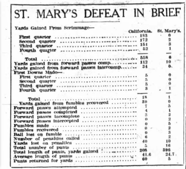 The final statistics were, if possible, even more one-sided than the score. California gained 412 yards rushing to -4 for St. Mary’s. The Bears had 146 yards passing, St. Mary’s had 10. In total, California out-gained St. Mary’s 558-6. California had 18 first downs, St. Mary’s had 1, which came on its lone completed pass.
