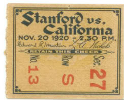 A genuine ticket to the 1920 Big Game – used by my own grandfather.The two signatures are “Edward R. Martin,” the Graduate Manager at Stanford, and “L. A. Nichols,” the Graduate Manager for California.