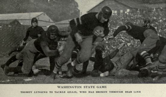 The Bears tore through Nevada’s line for large gains on play after play. By consensus the star of the game was Irving “Crip” Toomey who had two long runs of 50 and 55 yards, scored four touchdowns, and kicked a field goal and six extra points – all in the first half! The Chronicle‘s van Horn raved that “Toomey’s play this season has been a revelation” and in the Nevada game, “he went better than ever.” Van Horn added, “after the first half, the score stood 45-0 in favor of California, and the score sheet looked like Toomey was the whole eleven men on the California team.” The Tribune‘s Doug Montell concurred, calling Toomey “the star of the game.” Not to be outdone, Jack James of the Examiner called Toomey, “California’s bright and shining light.”