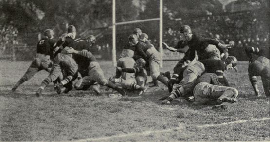 Late in the second half the Bears, in van Horn’s words, “began to play a little football.” A big hit by Brick Muller and Bob Berkey forced the Winged O’s star, “Chaff” Charlton, to fumble a punt, and Muller recovered the ball at the Olympic Club 25-yard-line. Two plays later, Cal’s “Duke” Morrison went around left end to score. Toomey kicked the extra point and the Bears went into halftime with a 7-0 lead. Captain Cort Majors warned his teammates not to be complacent. “Okay gang,” he told them, “the score’s nothing-to-nothing. Let’s go to work.” That phrase became the Wonder Teams’ unofficial team motto for the next five seasons.