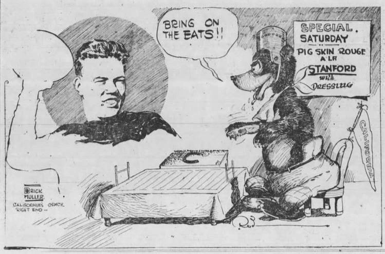 The Oakland Tribune‘s cartoonist anticipating California star Brick Muller serving up Pig Skin Rouge a la Stanford to the hungry Bears in the paper’s November 17, 1920 edition