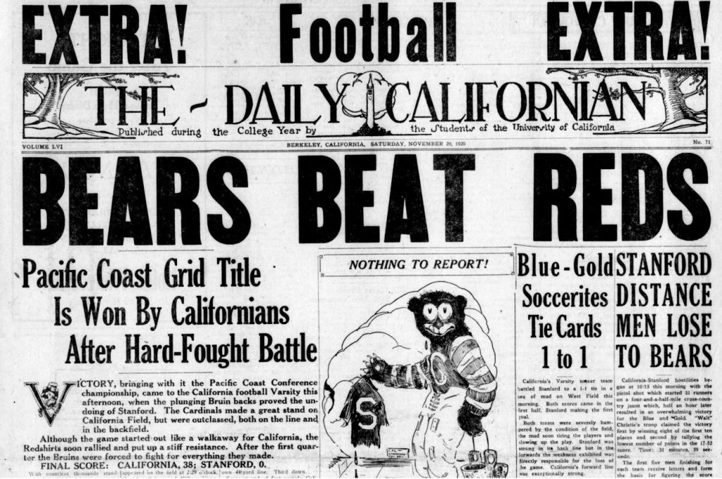 The Daily Californian‘s special Extra edition, which appeared on the afternoon of on November 20, 1920. It was the first Extra ever produced by the Daily Cal, which bragged that it carried the news of the victory before any other Bay Area newspaper.