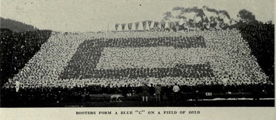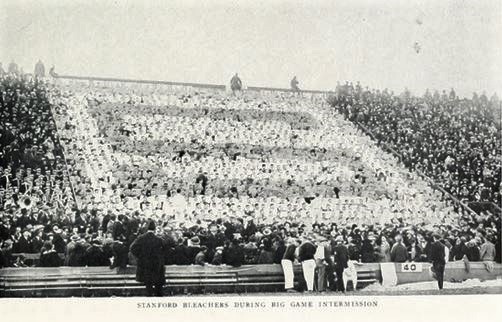 At the half the two rooting sections came alive with what all present regarded as the best half-time stunts ever. Stanford began with its band playing a funeral march. The Stanford rooters sang along, “We’re going to bury you, California,” as their card stunt showed a coffin with a yellow “C” on it. Then the card section put up a red “S,” against a white field, followed by a “T,” and then an “A” until the word “STANFORD” had been spelled out one letter at a time.