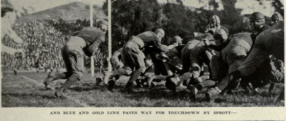 The score still stood at 5-0 at the half, but the game would be all in California’s favor in the second half. “Locomotive” Smith ran a punt back 35 yards early in the second half, and was tackled at the Stanford 2. “Lol” Pringle took it in for a touchdown. “Kangaroo” Pete Kaarsberg’s kick was good and the Bears led 11-0. (Kaarsberg got his “Kangaroo” nickname from his ability to leap over opposing players at the line of scrimmage and come down running. In fact, he had straps sewn onto his pants which his teammates used to lift him and throw him over the line of scrimmage.)