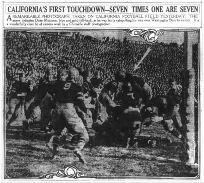 Final score, California 21, Olympic Club 0. Bay Area sportswriters heaped praise on Charlton and Dobson of the Olympic Club, and the San Francisco Examiner singled out Cal’s Duke Morrison and Brick Muller as “phenoms.” It was a solid win for Andy Smith and his Bears, especially considering how short a time they had been practicing. But it was certainly not spectacular. The Chronicle‘s van Horn opined that the Bears were “still weak in the aerial line,” i.e., the passing game, but found that to be their only significant weakness, at least once they got past a jittery first half.