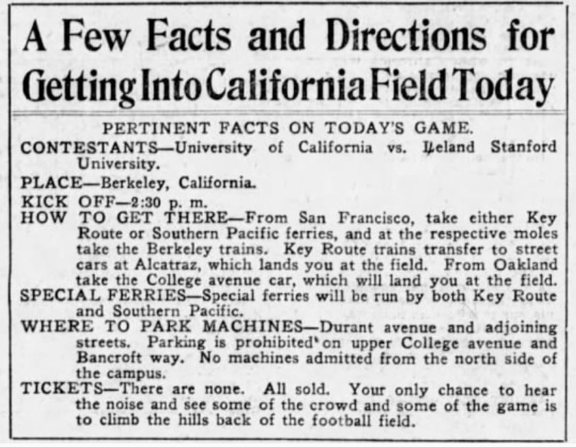 Extra ferries from San Francisco were added and thousands of fans were expected to arrive by automobile. Indeed, after the game a reporter for the San Francisco Examiner estimated that there were some 15,000 “machines” (as cars were often called at the time) in Berkeley on game day. While this estimate seems improbably high, all the free city parking provided on Durant, Channing, Telegraph and other streets near the stadium was taken. More drivers, as well as pedestrians, headed up into the Berkeley hills to find a spot to watch the game through binoculars.