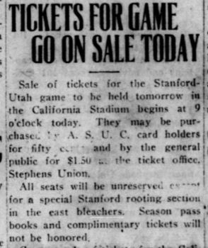 The demand for tickets resulted in large-scale scalping, which was illegal. Despite this, there were reports of a hotel in Oakland charging $50 per ticket and another in San Francisco asking $150 for a pair, the equivalent of nearly $2,500 in 2020 dollars. Two Stanford students caught trying to sell their student rooter tickets for $12.50 had their tickets canceled. They were also suspended from all student activities for a week, placed on probation and “blacklisted for all time from getting tickets to the big football games,” according to the San Francisco Chronicle. California Graduate Manager Lute Nichols also warned of counterfeit tickets being sold around the Bay Area.