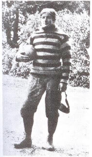 The Golden Bears’ next score, in the third quarter, resulted from an nice combination of offense, defense and “special teams” play. A long California drive ended in a turnover on downs at the Winged O’s 1-yard-line. Switching to defense, the Bears stopped the Olympic Club from making a first down, forcing a punt from their own end zone. Crip Toomey ran the punt back to the 15 and three plays later Duke Morrison was able to plunge through the Olympic Club line from the 8, for his second touchdown of the day. Switching to his role as kicker, Toomey added another extra point. As the Chronicle‘s reporter described it, “all through the second half, the big hole in the Olympic Club was through center and the guards.” [Note: that seems like a very big hole!]